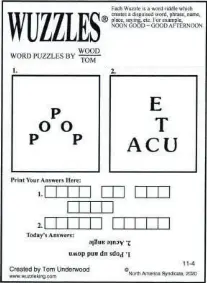 Wuzzles are word puzzles consisting of combinations of words, letters, figures or symbols positioned to create disguised words, phrases, names, places, sayings etc. In other words, a wuzzle puzzle is a word or phrase that you have to find by looking carefully at how the word … A commonyms is group of words that have a common trait in the three words/items listed. Pain in the neck 7. The trick to solving a wuzzle is to figure out their missing "concept" because the concept are things such as over, under, in, on, before, after, between to name a few.